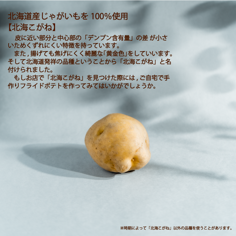 どうして男爵いもなのか。それは男爵いものデンプンの含有量に関係します。このデンプンの絶妙な量によっていも本来の旨味を損なわずにカリカリ食感を作りだすことができます。